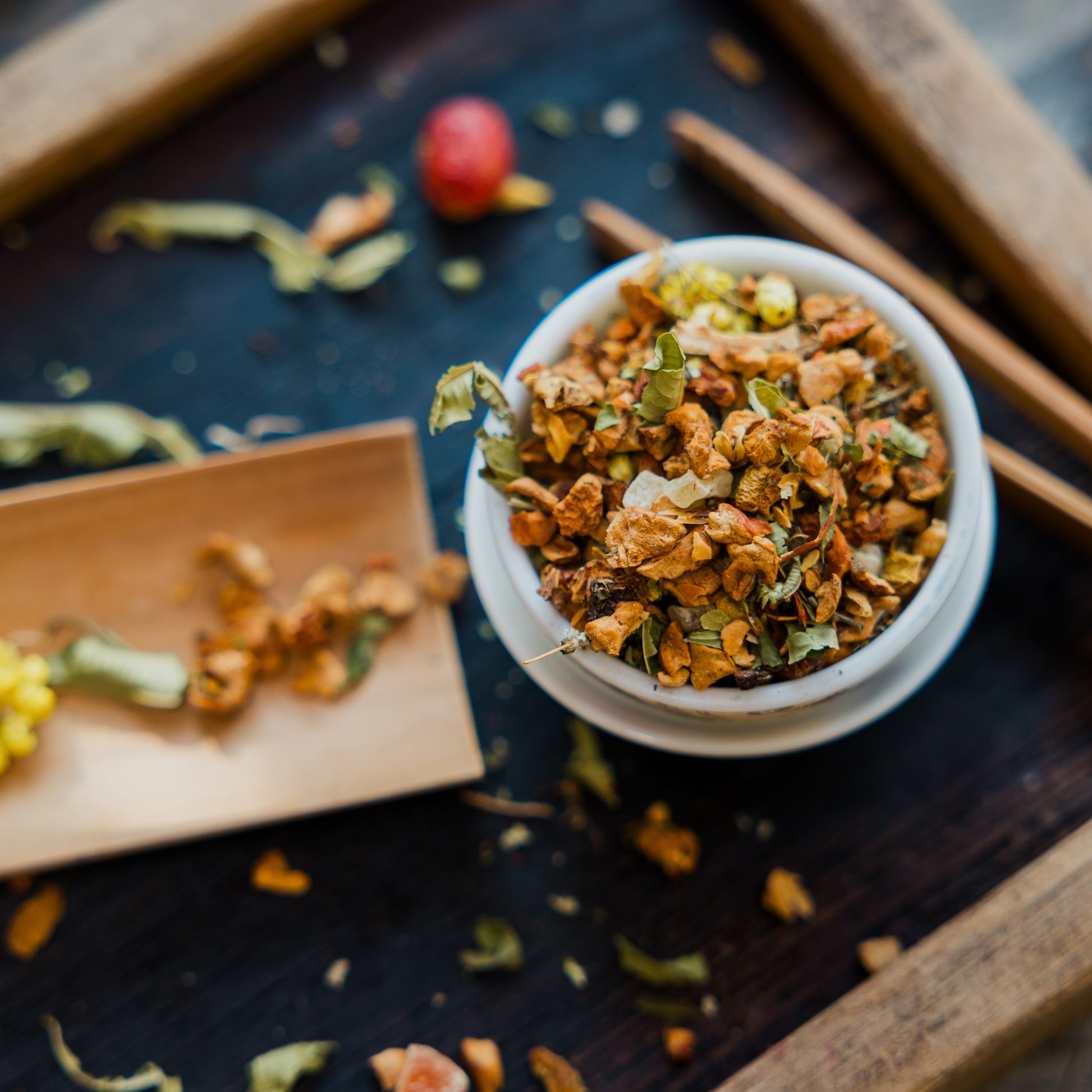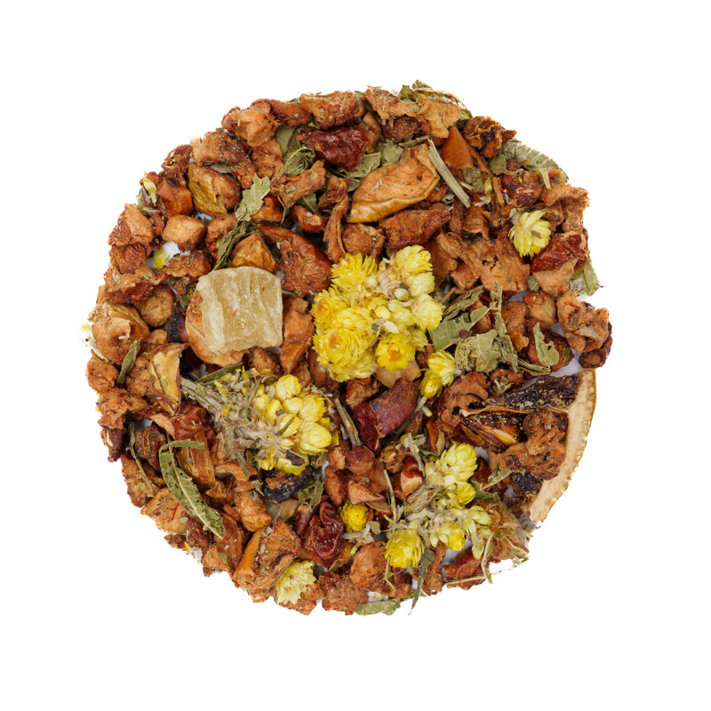 Apple, pineapple (pineapple, sugar), lemon peels, papaya (papaya, sugar), natural flavouring, verbena whole, blackberry leaves, lemon pieces, cudweed, safflower petals, cranberry (1%), acerola (1%).