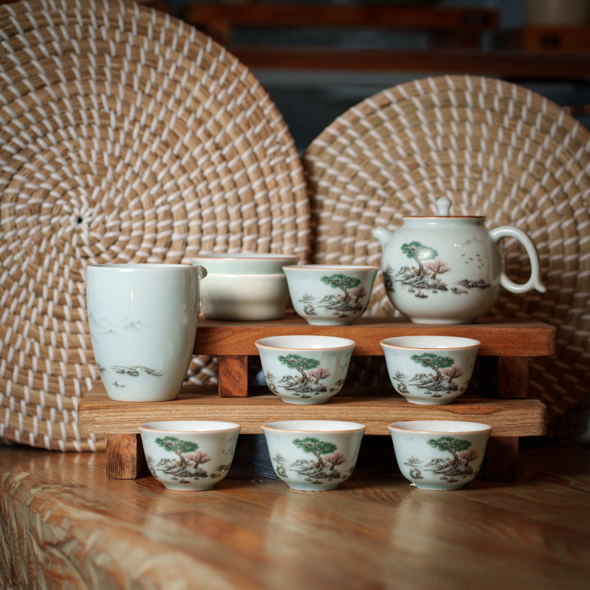 This elegant porcelain tea set brings timeless beauty and calm sophistication to any tea ritual. Crafted from fine porcelain in a soft celadon tone, each piece is adorned with delicate hand-painted landscape motifs inspired by traditional Eastern art. The harmonious scenery of trees and nature creates a serene and refined aesthetic.