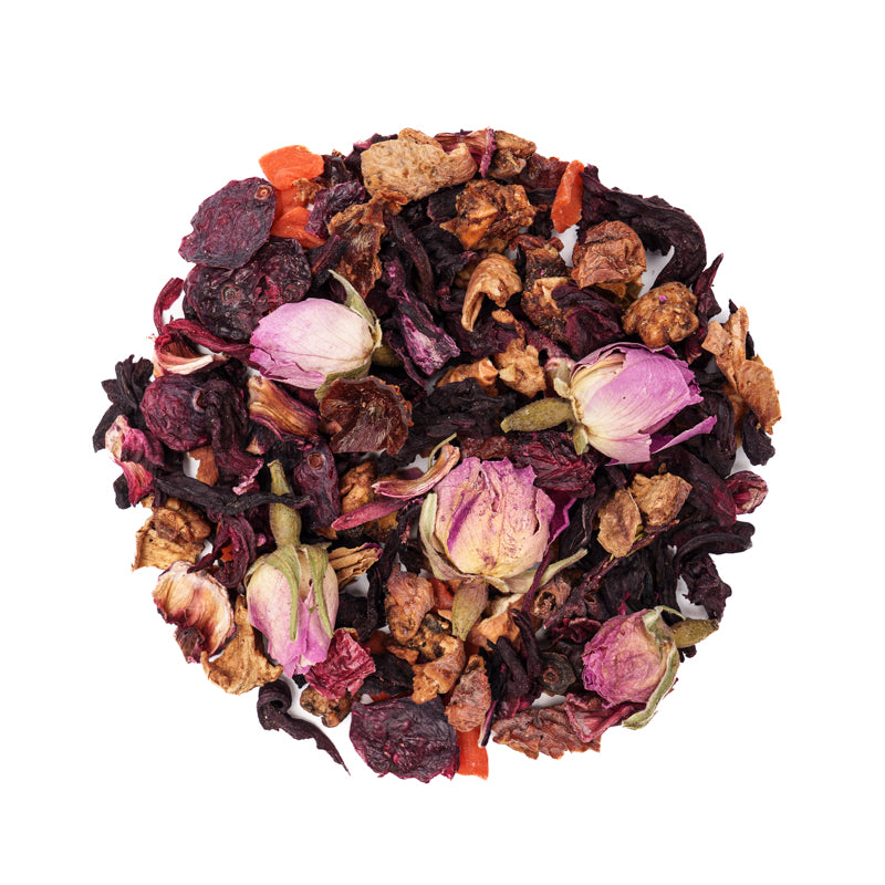 Rooibos natural, date, grape, ginger, natural flavouring, mango pieces, peppermint, papaya, fig, mango, vanilla. Premium blend with ingredients from sustainable cultivation and natural flavourings.